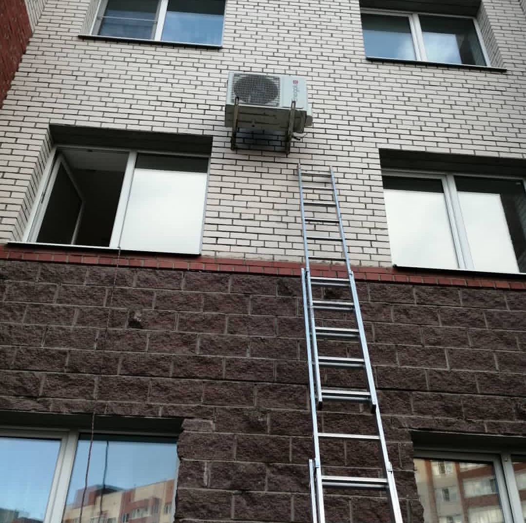 Установлено: Монтаж наружного блока 18 модели с лестницы. Высота монтажа 6 метров. Страховали снизу с помощью верёвки.